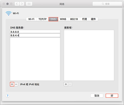 4. 点击DNS的选项卡, 然后点击左下角 “ + ”, 添加 8.8.8.8 和 8.8.4.4 , 单击 “ 好 ”